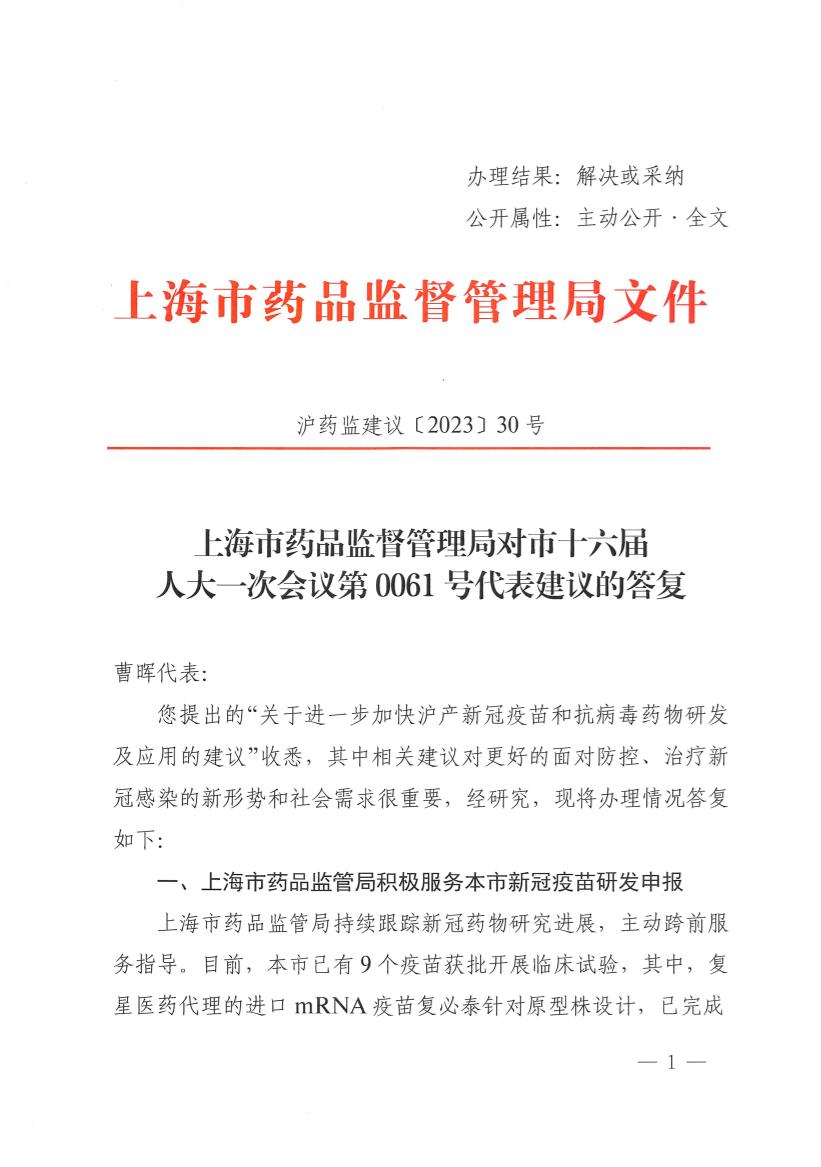 您提出的“关于进一步加快沪产新冠疫苗和抗病毒药物研发及应用的建议”收悉,其中相关建议对更好的面对防控、治疗新冠感染的新形势和社会需求很重要,经研究,现将办理情况答复如下: