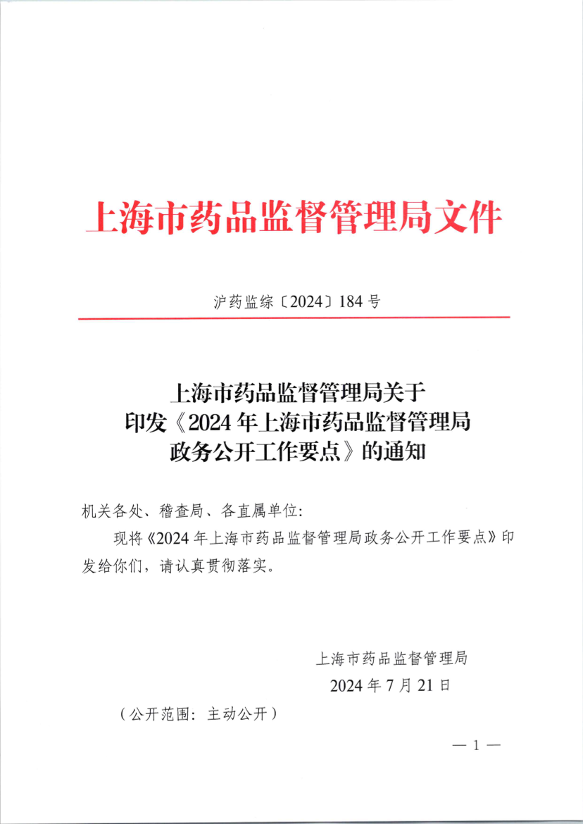 2024年是实施“十四五”规划的攻坚之年。上海市药品监管局认真落实党中央、国务院和市委、市政府关于做好新时代政务公开工作的决策部署,根据上海市政务公开工作要求,围绕公开促落实、优服务、强监管,以更高质量政务公开服务生物医药产业高质量发展和高水平安全。