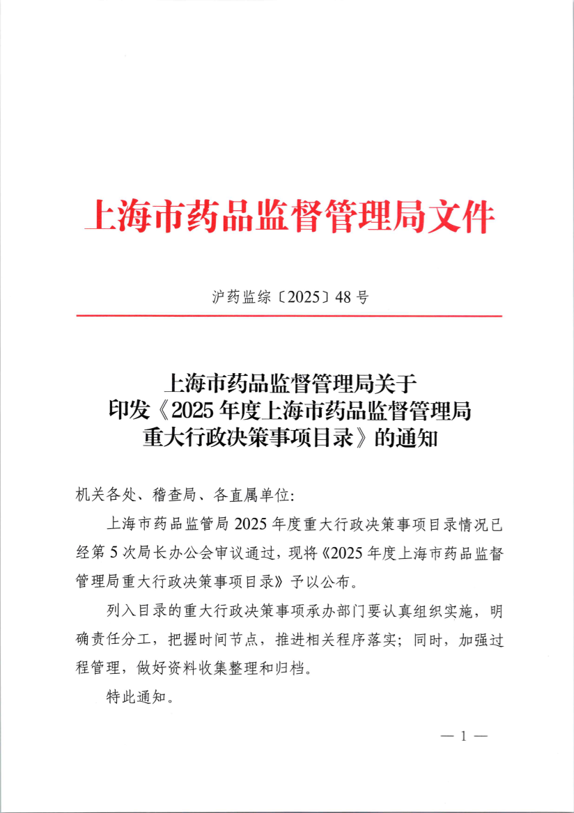 上海市药品监管局2025年度重大行政决策事项目录情况已经第5次局长办公会审议通过,现将《2025年度918博天堂重大行政决策事项目录》予以公布。
