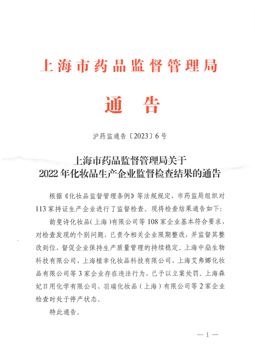 韵斐诗化妆品(上海)有限公司等108家企业基本符合要求,对检查发现的个别问题,已责令相关企业限期整改,并监督其整改到位,督促企业保持生产质量管理的持续稳定。上海中燊生物科技有限公司、上海植幸化妆品科技有限公司、上海艾弗娜化妆品有限公司等3家企业存在违法行为,已予以立案处罚。上海森妃日用化学有限公司、羽瑞化妆品(上海)有限公司等2家企业检查时处于停产状态。