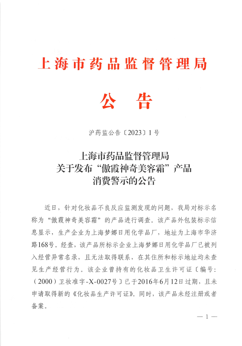 近日,针对化妆品不良反应监测发现的问题,我局对标示名称为“傲霞神奇美容霜”的产品进行调查。该产品外包装标示信息显示,生产企业为上海梦娜日用化学品厂,地址为上海市华济路168号。经查,该产品所标示企业上海梦娜日用化学品厂已被列入经营异常名录,且无法取得联系,在其住所和标示地址均未查见生产经营行为。该企业曾持有的化妆品卫生许可证〔编号:(2000)卫妆准字-X-0027号〕已于2016年6月12日过期,且未申请取得新的《化妆品生产许可证》。同时,该产品未经注册或者备案。