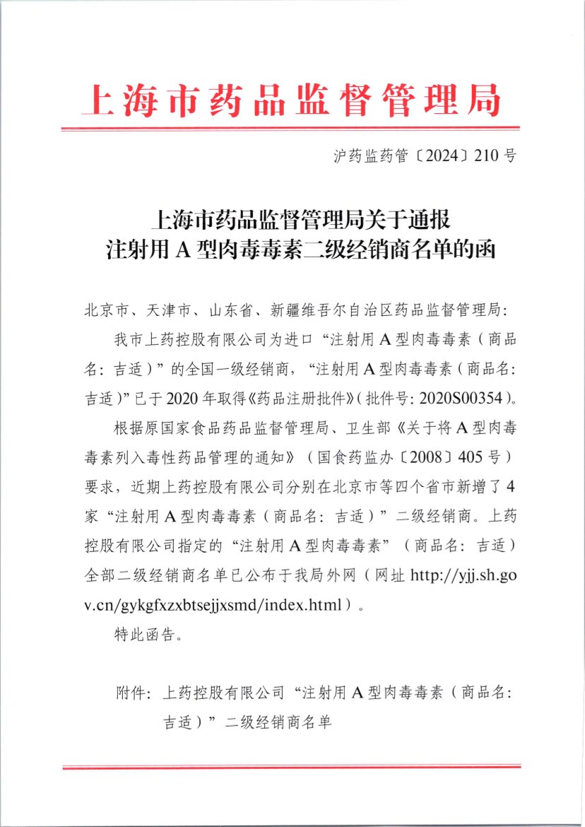 根据原国家食品药品监督管理局、卫生部《关于将A型肉毒毒素列入毒性药品管理的通知》(国食药监办〔2008〕405号)要求,近期上药控股有限公司分别在北京市等四个省市新增了4家“注射用A型肉毒毒素(商品名:吉适)”二级经销商。上药控股有限公司指定的“注射用A型肉毒毒素”(商品名:吉适)全部二级经销商名单已公布于我局外网(网址http://m.dmxh.cc/gykgfxzxbtsejjxsmd/index.html)。