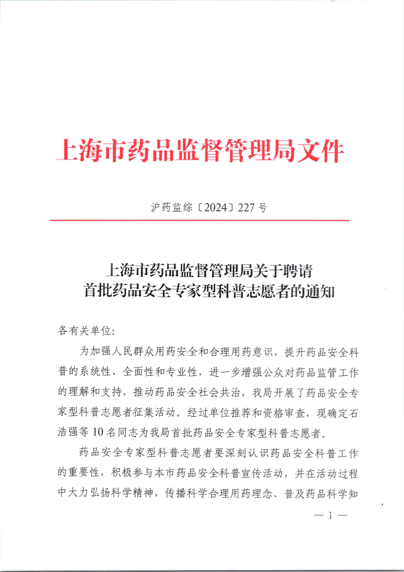 为加强人民群众用药安全和合理用药意识,提升药品安全科普的系统性、全面性和专业性,进一步增强公众对药品监管工作的理解和支持,推动药品安全社会共治,我局开展了药品安全专家型科普志愿者征集活动。经过单位推荐和资格审查,现确定石浩强等10名同志为我局首批药品安全专家型科普志愿者。