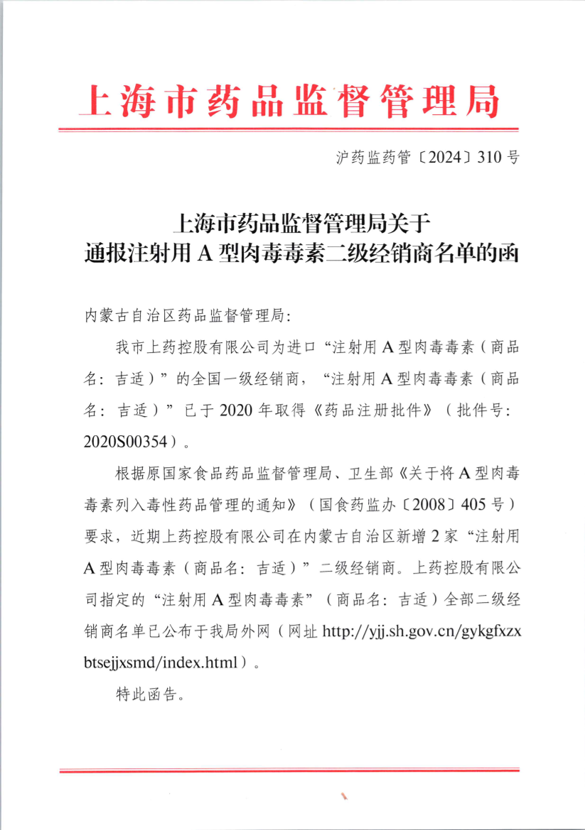 根据原国家食品药品监督管理局、卫生部《关于将A型肉毒毒素列入毒性药品管理的通知》(国食药监办〔2008〕405号)要求,近期上药控股有限公司在内蒙古自治区新增2家“注射用A型肉毒毒素(商品名:吉适)”二级经销商。上药控股有限公司指定的“注射用A型肉毒毒素”(商品名:吉适)全部二级经销商名单已公布于我局外网(网址https://www.dmxh.cc/gykgfxzxbtsejjxsmd/index.html)。