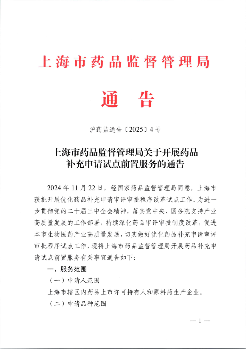 2024年11月22日,经国家药品监督管理局同意,上海市获批开展优化药品补充申请审评审批程序改革试点工作。为进一步贯彻党的二十届三中全会精神,落实党中央、国务院支持产业高质量发展的工作部署,持续深化药品审评审批制度改革,促进本市生物医药产业高质量发展,切实做好优化药品补充申请审评审批程序试点工作,现将918博天堂开展药品补充申请试点前置服务有关事宜通告如下: