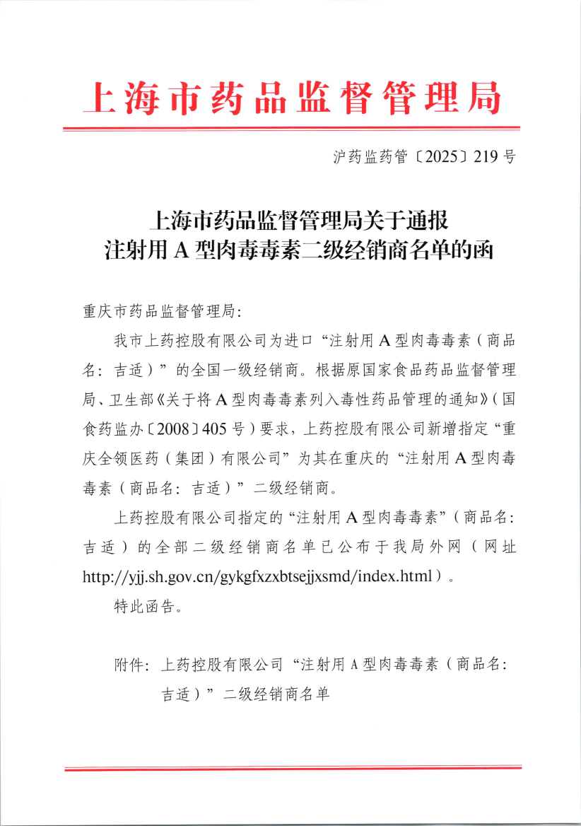 我市上药控股有限公司为进口“注射用A型肉毒毒素(商品名:吉适)”的全国一级经销商。根据原国家食品药品监督管理局、卫生部《关于将A型肉毒毒素列入毒性药品管理的通知》(国食药监办〔2008〕405号)要求,上药控股有限公司新增指定“重庆全领医药(集团)有限公司”为其在重庆的“注射用A型肉毒毒素(商品名:吉适)”二级经销商。
