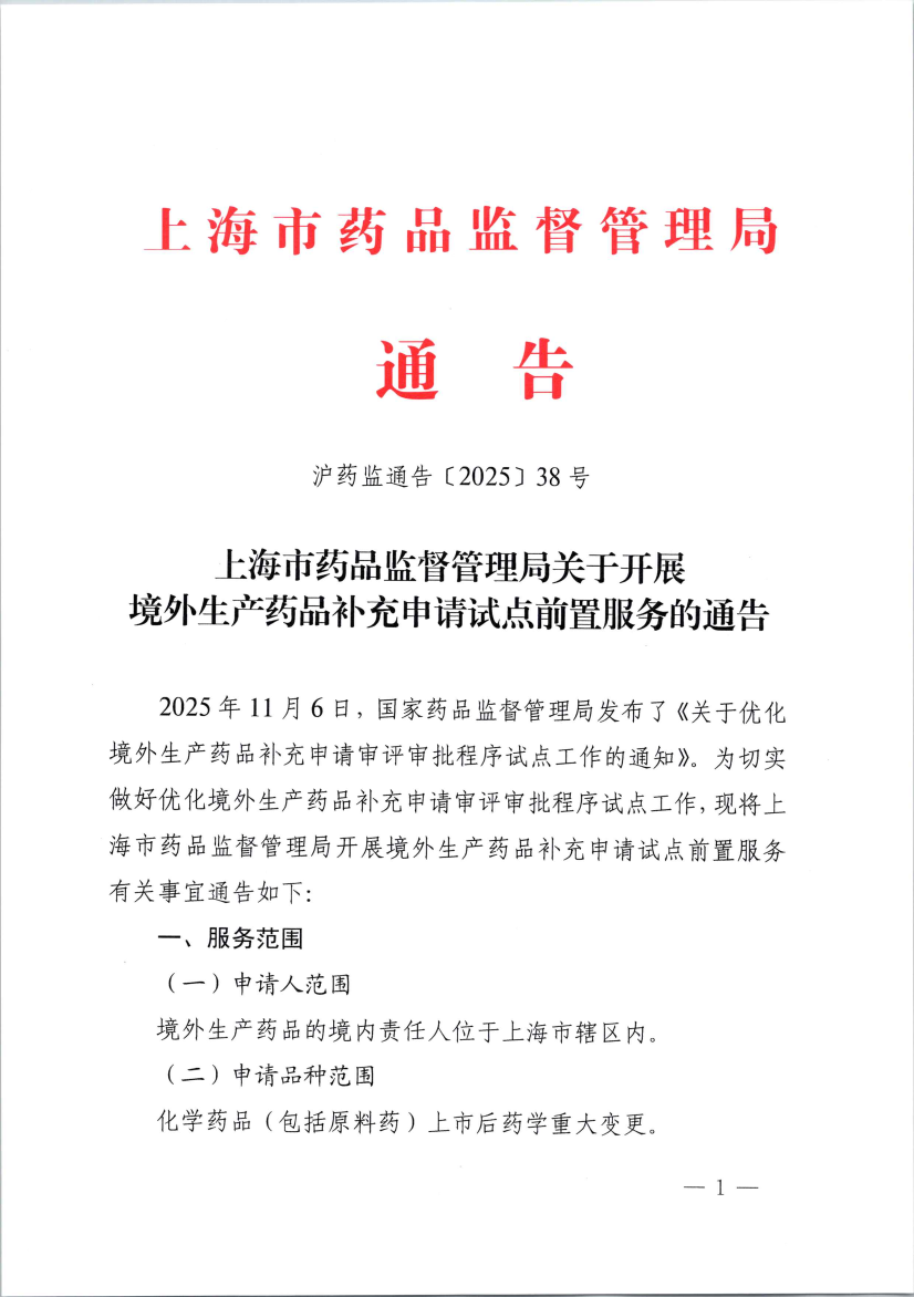2025年11月6日,国家药品监督管理局发布了《关于优化境外生产药品补充申请审评审批程序试点工作的通知》。为切实做好优化境外生产药品补充申请审评审批程序试点工作,现将918博天堂开展境外生产药品补充申请试点前置服务有关事宜通告如下: